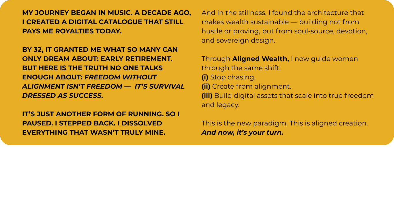 Aligned Wealth exists for the woman done waiting — ready to live audaciously, in her power, and on her terms.